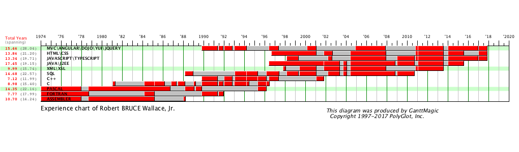 11/1997 thru 1/1998: Java Architect PolyGrafX, Chattanooga, TN Scott Wallace, Supervisor keywords: XML, DTD, Java, education, graphics, Solaris, Win95, Unix | Developed GanttMagic, a set of Java/XML utilities for publishing resumes and job requirements in a number of formats including graphical GANTT charts. Also, taught in-house classes on XML. |